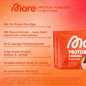 Warnhinweise Zur Sicherstellung der optimalen Verträglichkeit und Wirkung, bitte vor dem Verzehr gemäß unserer Zubereitungsempfehlung zubereiten und quellen lassen. Ungequollen nicht zum Verzehr geeignet. Eine abwechslungsreiche und ausgewogene Ernährung sowie eine gesunde Lebensweise sind wichtig. Lagerung: Trocken, verschlossen, vor Licht und Wärme geschützt lagern Bestandteile MILCHproteinkonzentrat 55 %, VollkornHAFERflocken (glutenfrei) 39 %, Glucomannan (aus Konjakwurzel) 2 %, Flohsamenschalenpulver, lösliche Ballaststoffe (Mais), Salz, Laktase, Süßungsmittel (Steviolglycoside aus Stevia). Gebrauchsanweisung Für eine Portion, 62 g Proteinporridge (1 Sachet) mit 200 ml heißem oder kaltem Wasser übergießen und mit dem Schneebesen verrühren. 5 Minuten abgedeckt quellen lassen und anschließend verzehren. Tipp: Mit 2 g Chunky Flavour (3/4 Chunky-Messlöffel) nach Wahl die Mischung beliebig aromatisieren und süßen (verändert die Nährwerte). Für eine effektive Unterstützung bei der Gewichtsreduktion empfehlen wir ausreichend (1-2 Gläser Flüssigkeit) zu der Mahlzeit zu trinken Haftungsausschluss Die Produktverpackung und entsprechende Dokumente enthalten möglicherweise Angaben, die über die auf unserer Internetseite gemachten Angaben hinausgehen und/oder sich von ihnen unterscheiden. Wir empfehlen Ihnen daher, sich nicht allein auf die Angaben zu verlassen, die auf unserer Internetseite angezeigt werden, sondern sich vor Gebrauch der Ware stets auch sorgfältig die Etiketten, Warnhinweise und Anleitungen durchzulesen, die mit der Ware geliefert werden.