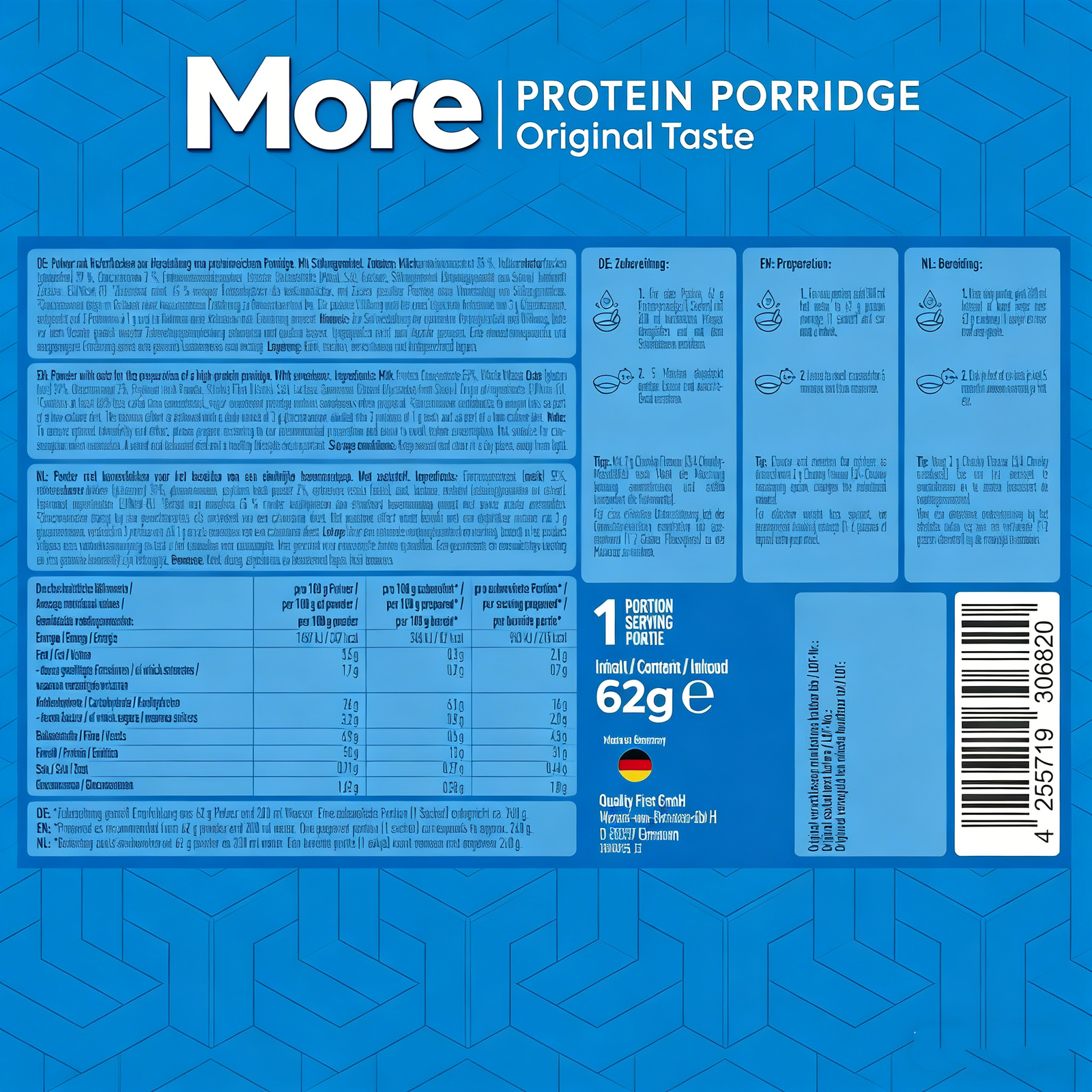 Warnhinweise Zur Sicherstellung der optimalen Verträglichkeit und Wirkung, bitte vor dem Verzehr gemäß unserer Zubereitungsempfehlung zubereiten und quellen lassen. Ungequollen nicht zum Verzehr geeignet. Eine abwechslungsreiche und ausgewogene Ernährung sowie eine gesunde Lebensweise sind wichtig. Lagerung: Trocken, verschlossen, vor Licht und Wärme geschützt lagern Bestandteile MILCHproteinkonzentrat 55 %, VollkornHAFERflocken (glutenfrei) 39 %, Glucomannan (aus Konjakwurzel) 2 %, Flohsamenschalenpulver, lösliche Ballaststoffe (Mais), Salz, Laktase, Süßungsmittel (Steviolglycoside aus Stevia). Gebrauchsanweisung Für eine Portion, 62 g Proteinporridge (1 Sachet) mit 200 ml heißem oder kaltem Wasser übergießen und mit dem Schneebesen verrühren. 5 Minuten abgedeckt quellen lassen und anschließend verzehren. Tipp: Mit 2 g Chunky Flavour (3/4 Chunky-Messlöffel) nach Wahl die Mischung beliebig aromatisieren und süßen (verändert die Nährwerte). Für eine effektive Unterstützung bei der Gewichtsreduktion empfehlen wir ausreichend (1-2 Gläser Flüssigkeit) zu der Mahlzeit zu trinken Haftungsausschluss Die Produktverpackung und entsprechende Dokumente enthalten möglicherweise Angaben, die über die auf unserer Internetseite gemachten Angaben hinausgehen und/oder sich von ihnen unterscheiden. Wir empfehlen Ihnen daher, sich nicht allein auf die Angaben zu verlassen, die auf unserer Internetseite angezeigt werden, sondern sich vor Gebrauch der Ware stets auch sorgfältig die Etiketten, Warnhinweise und Anleitungen durchzulesen, die mit der Ware geliefert werden.
